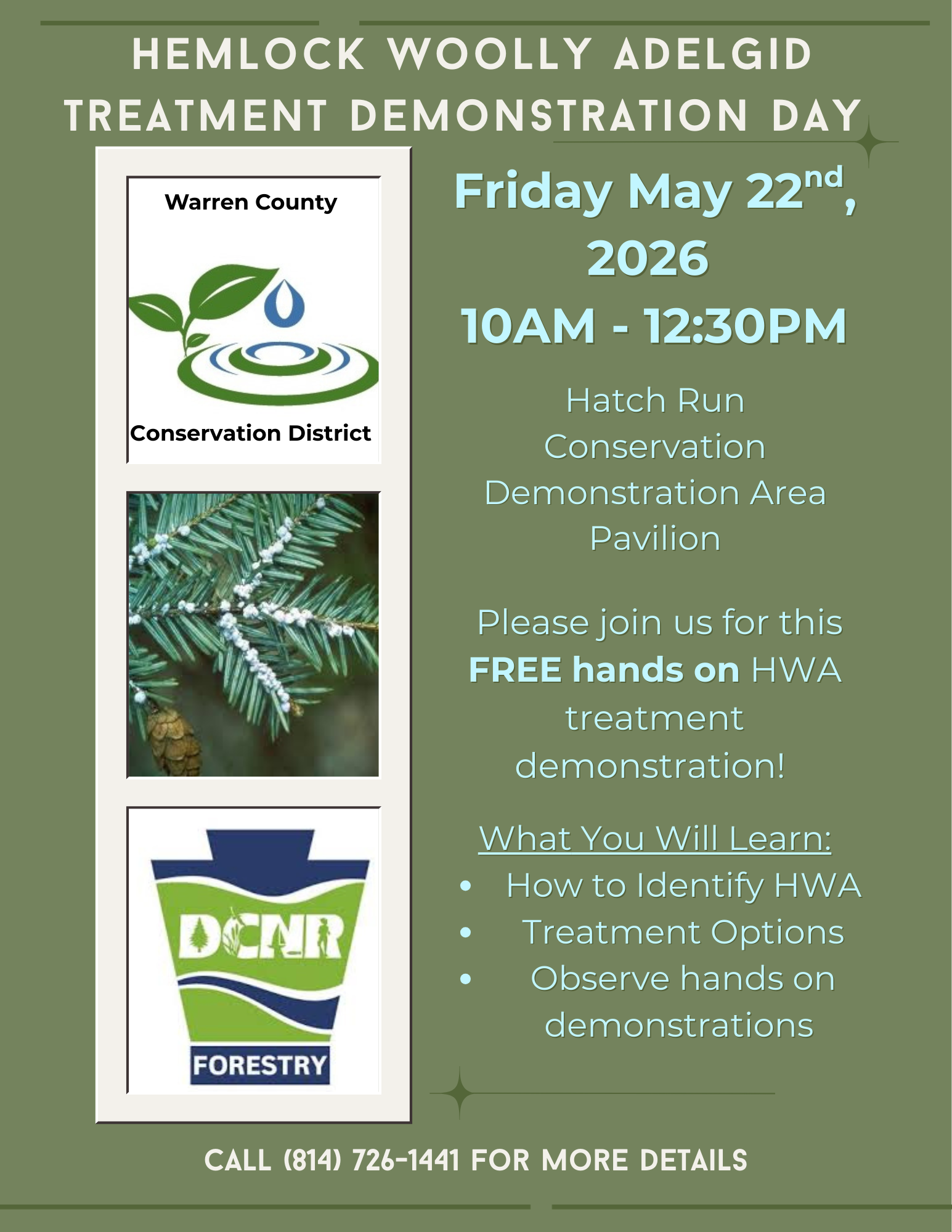HWA is an invasive species from Asia that was found in Pennsylvania in 1967. These insects feed on the fluid of hemlock trees and can lay 100 - 300 eggs at a time. Although some trees die within four years of infestation, some trees can persist for many years. Come to the Hatch Run Conservation Demonstration Area Pavilion and learn how to identify and treat HWA on your property. Download the flyer below for more information.